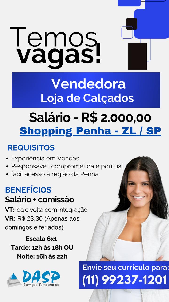 VENDEDORA DE CALÇADOS - SHOPPING PENHA - ZONA LESTE